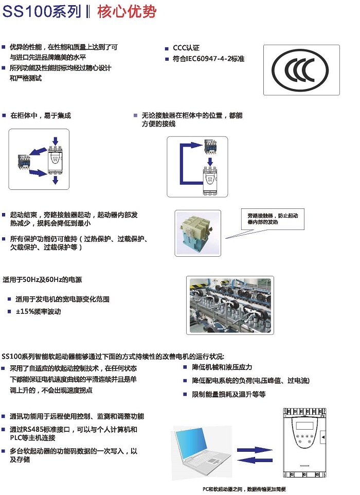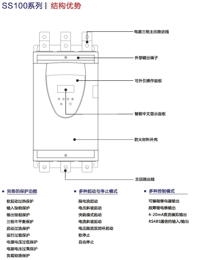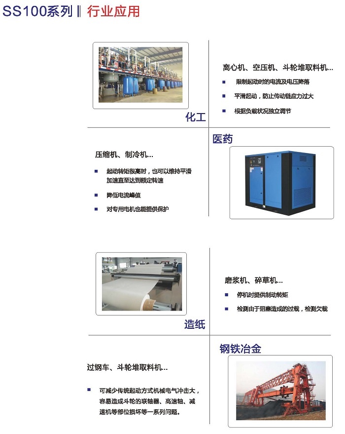SS100智能軟起動(dòng)器是我公司自主研發(fā)的、采用電力電子技術(shù),微處理技術(shù)及現(xiàn)代控制理論而設(shè)計(jì)生產(chǎn)的具有當(dāng)今國際先進(jìn)水平的起動(dòng)設(shè)備。該產(chǎn)品能有效地限制交流異步電動(dòng)機(jī)起動(dòng)時(shí)的起動(dòng)電流,可廣泛應(yīng)用于風(fēng)機(jī)、水泵、輸送類及壓縮機(jī)等負(fù)載,是傳統(tǒng)的星/三角轉(zhuǎn)換、自耦降壓、磁控降壓等降壓設(shè)備的理想換代產(chǎn)品。